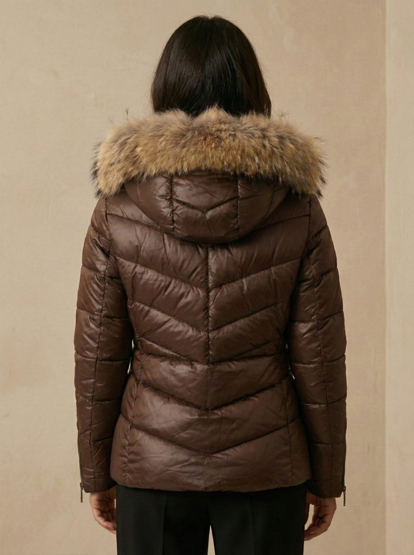 La capucha integrada es fija, lo que garantiza una mayor protección frente al viento y las bajas temperaturas. Incorpora un elegante ribete de pelo de mapache, que puede retirarse fácilmente, permitiendo adaptar el estilo del abrigo según la ocasión o las preferencias personales. Este detalle aporta un toque sofisticado y funcional a la prenda.
