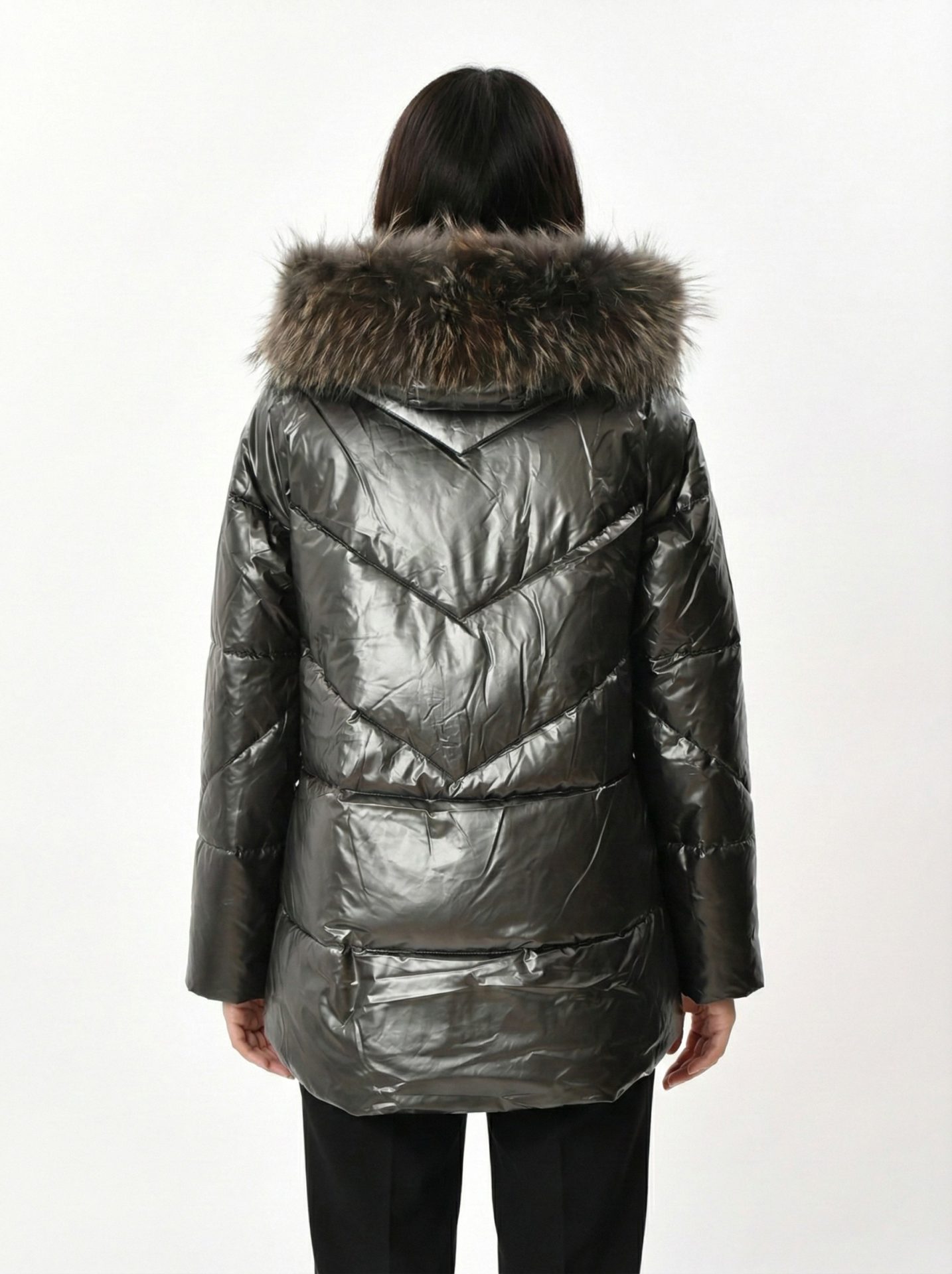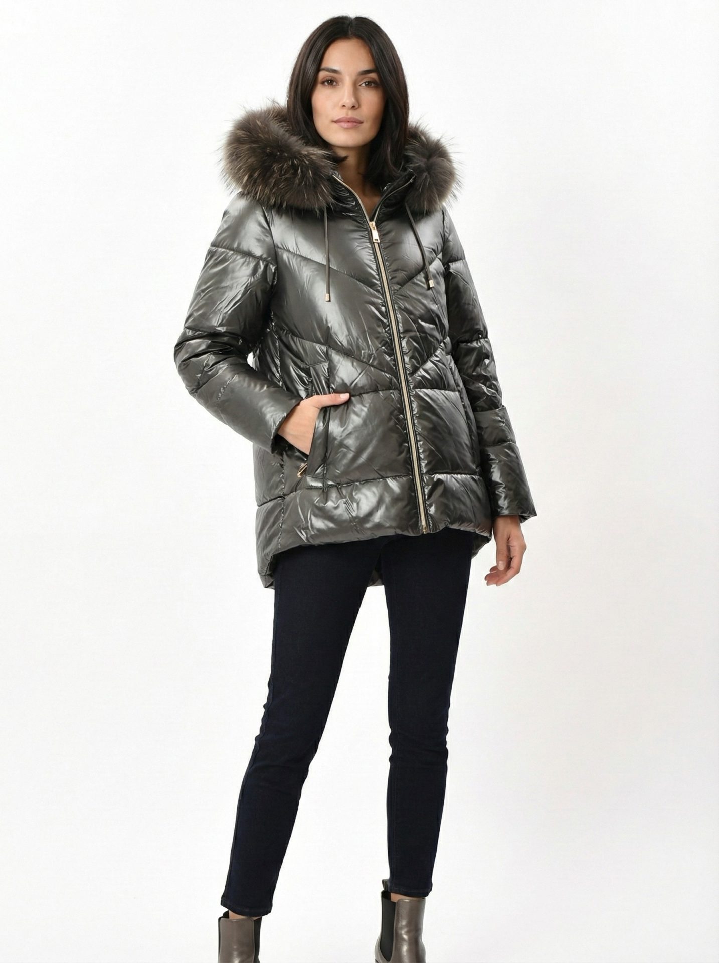 Abrigo acolchado metalizado con capucha pelo natural